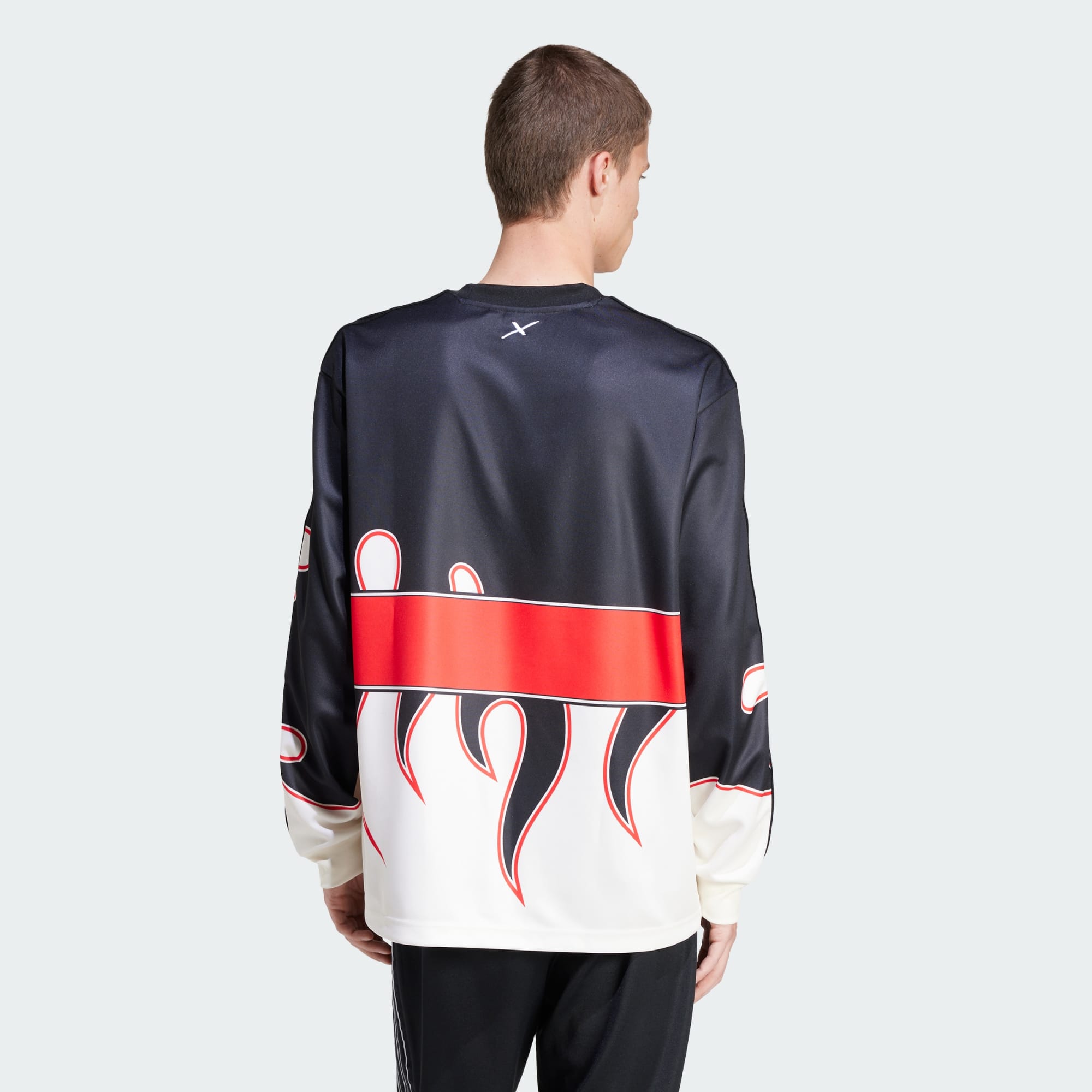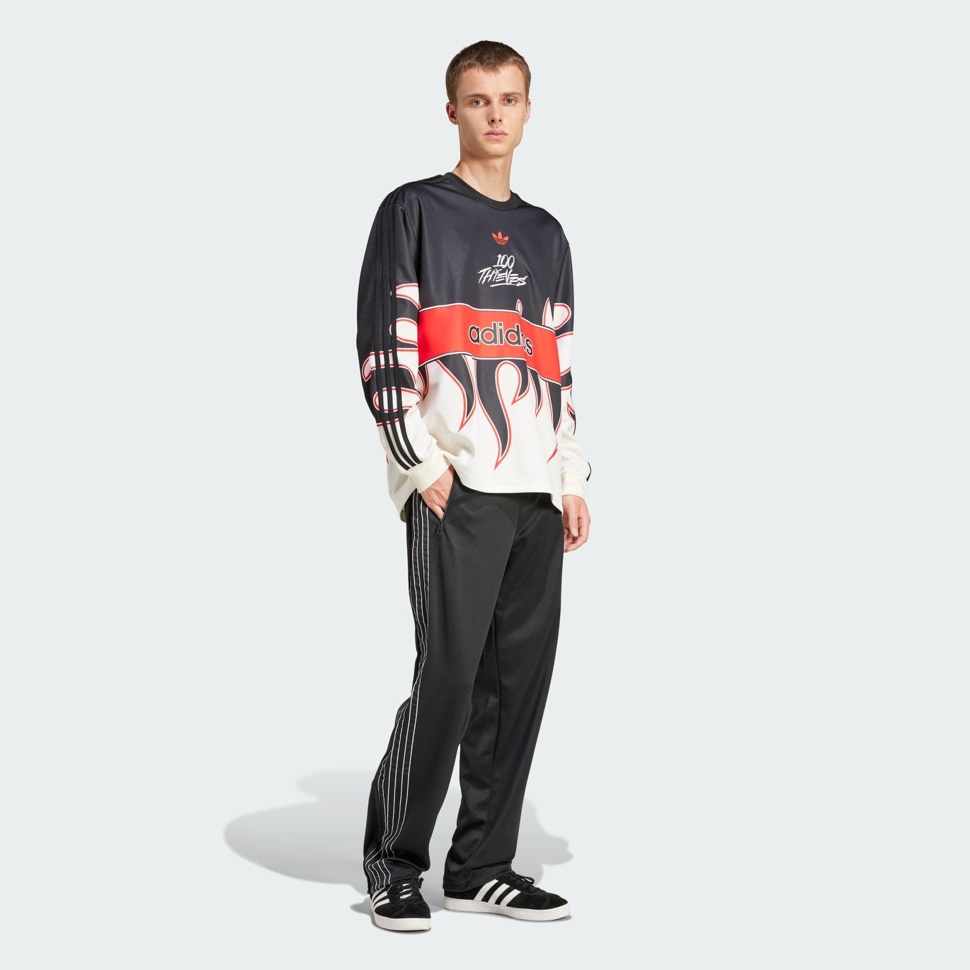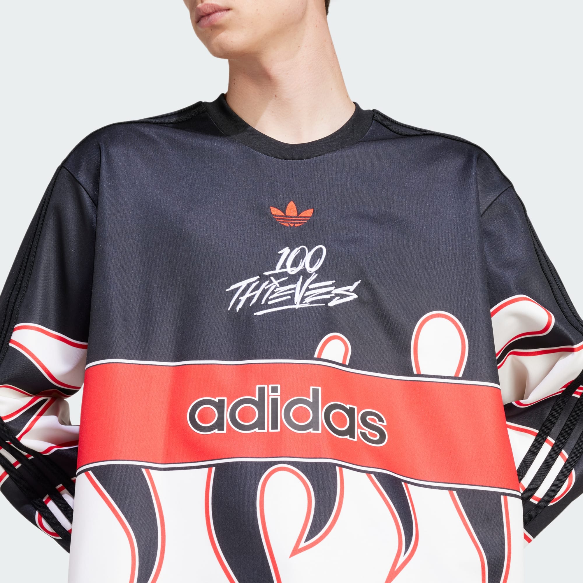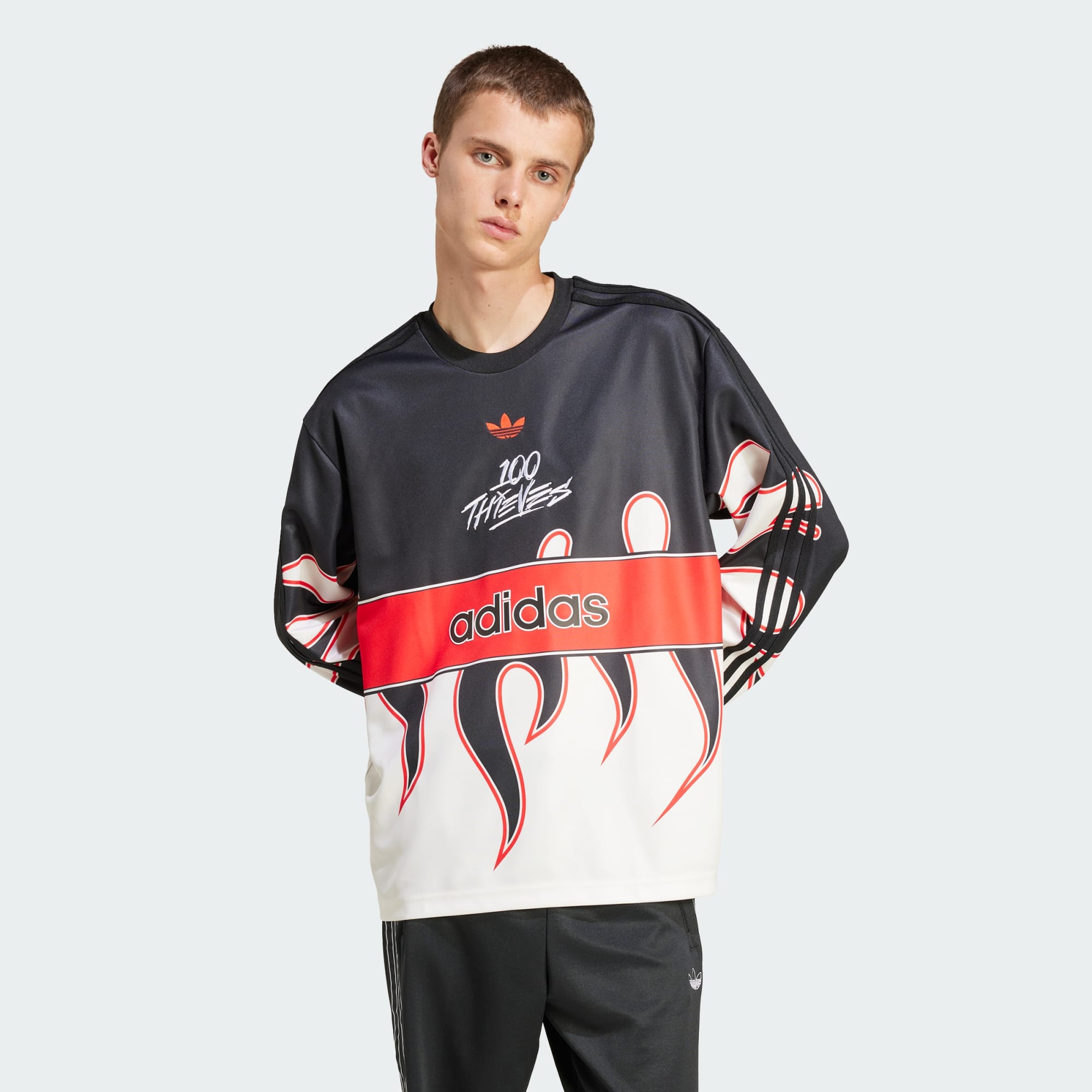 An adidas x 100 Thieves tee with heavy hits of fiery details.