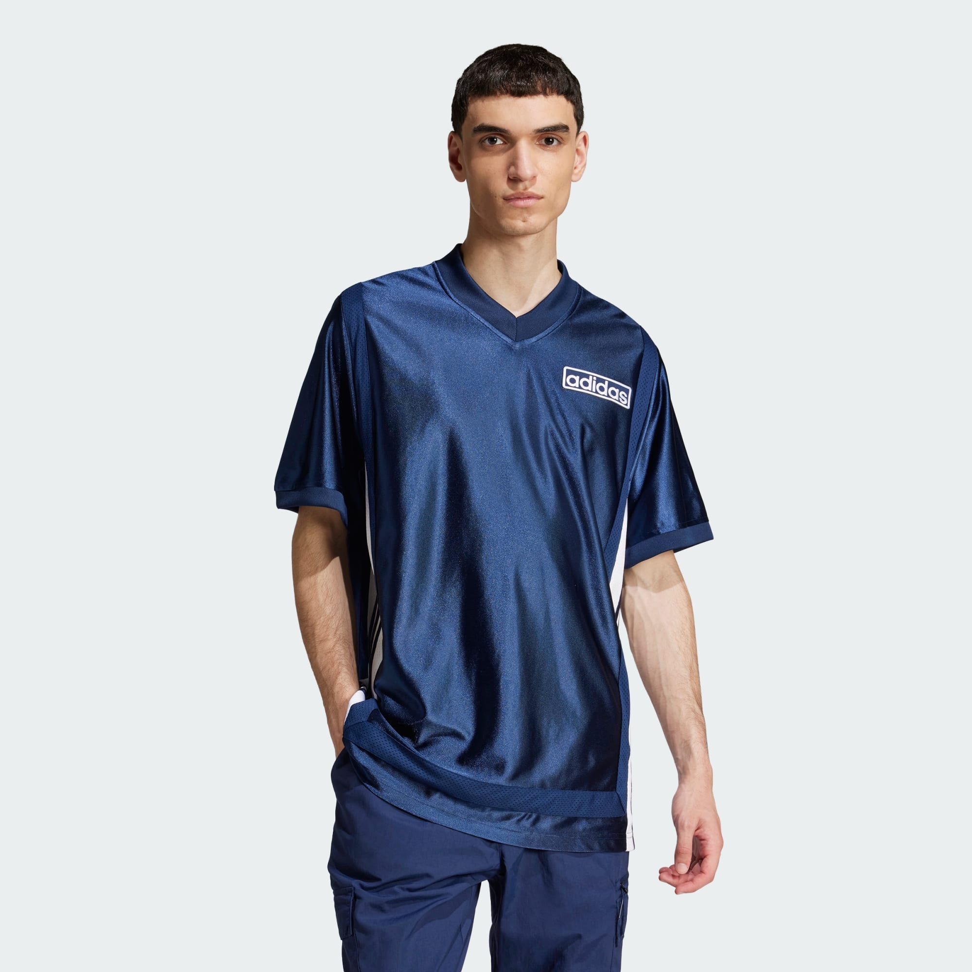 A V-neck adidas jersey with iconic Adibreak style.
