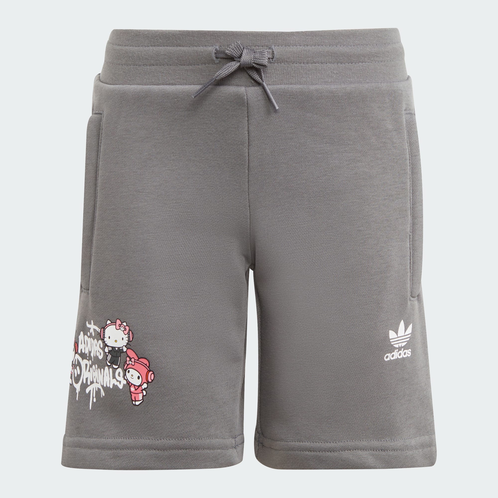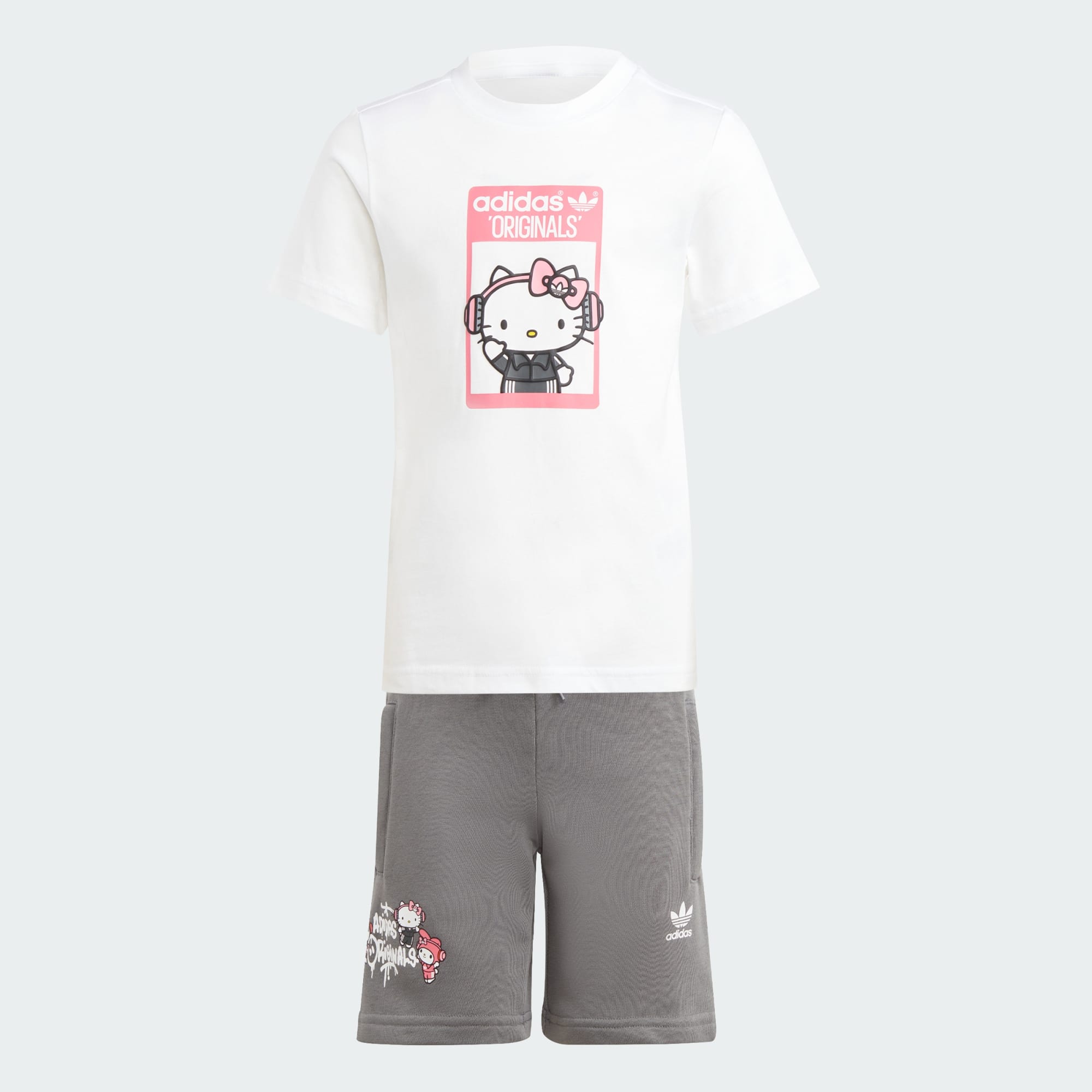 The bow and the three stripes are back! No matter who and how different you are, Hello Kitty knows what friendship is all about. Follow Hello Kitty and Friends through a unique and unexpected lens that ties into adidas Originals' history: time for Hello Kitty together with My Melody and Kuromi to inspire smiles and carry a world of happiness through iconic Music references such as Hip Hop and Street. Hello Kitty brings her signature style of fun and friendship to this adidas set for kids. Whimsical graphics designed by Hello Kitty herself add extra delight to the soft French terry, perfect for little ones on the move. A twin zip pocket on the shorts keeps small trinkets close at hand, and the tee's fit stays comfortable through every daily adventure.