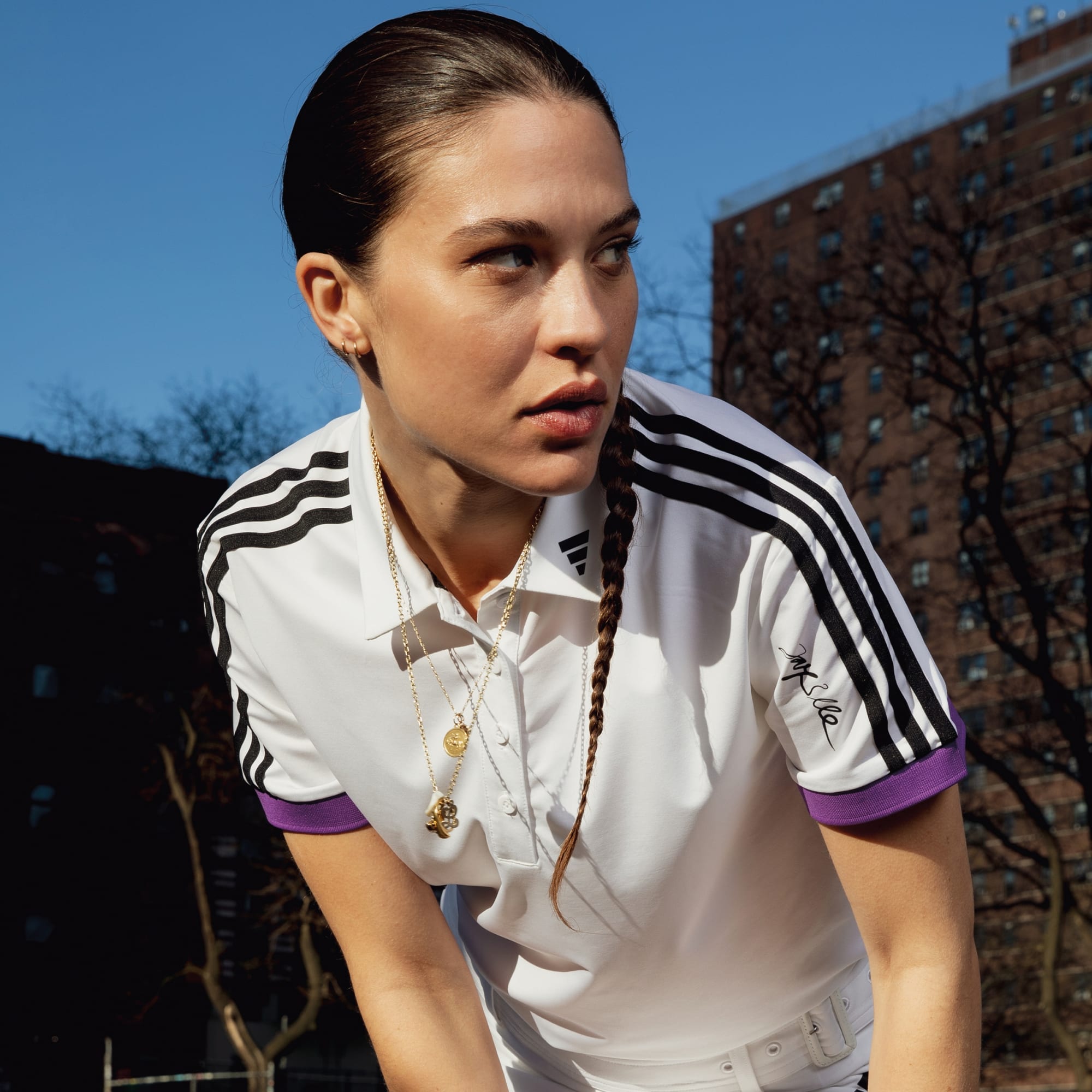 An adidas x Jay3lle golf polo shirt made in part with recycled materials.