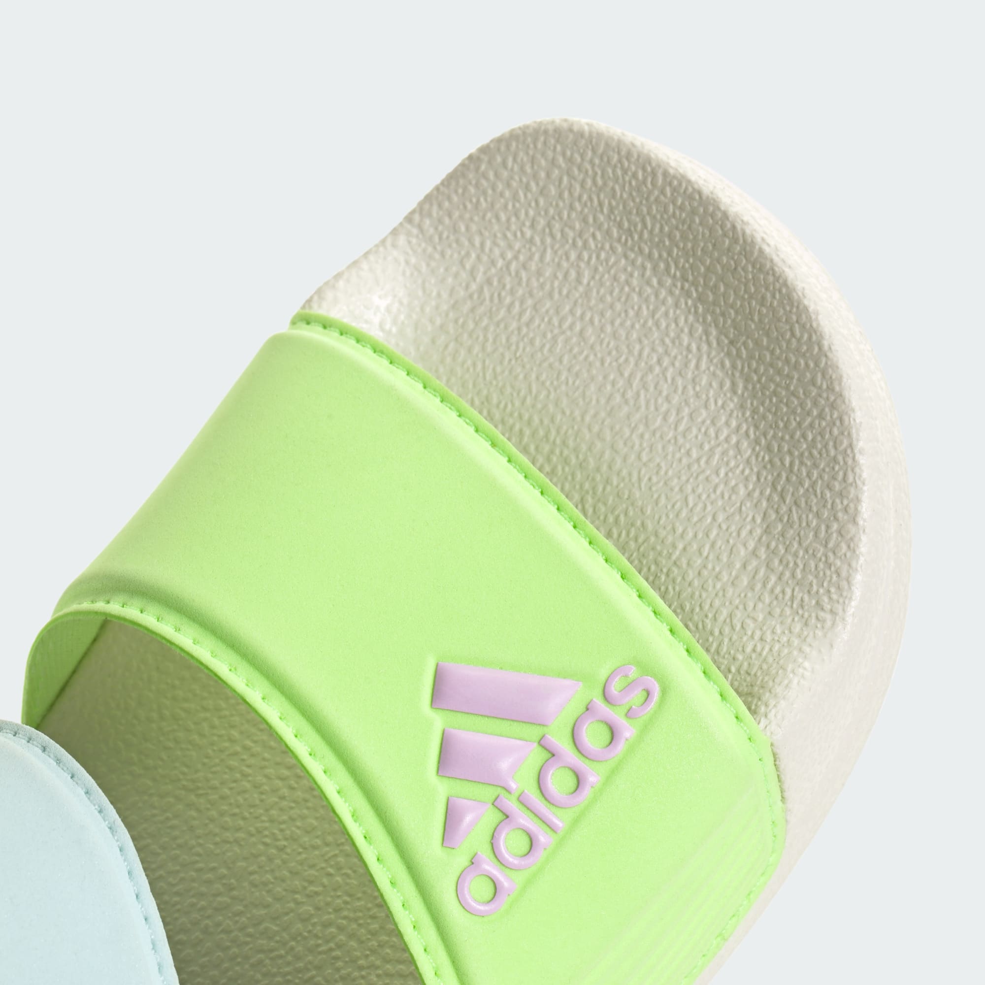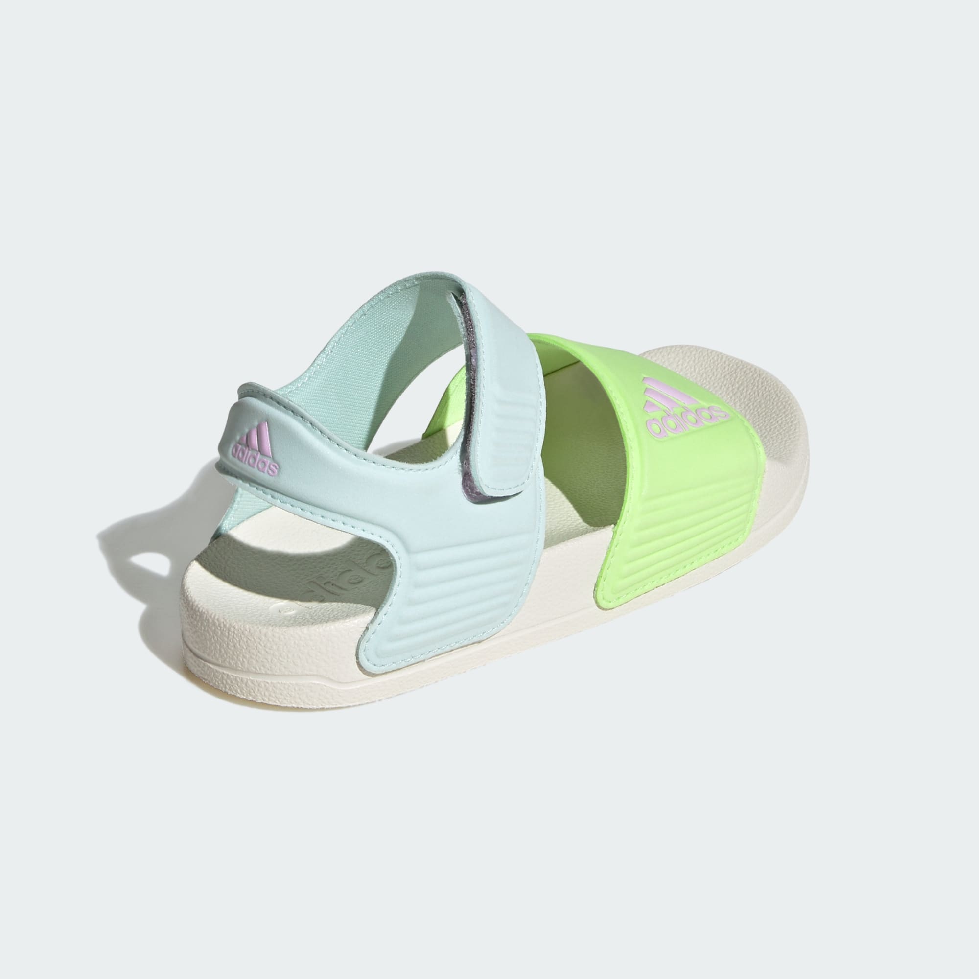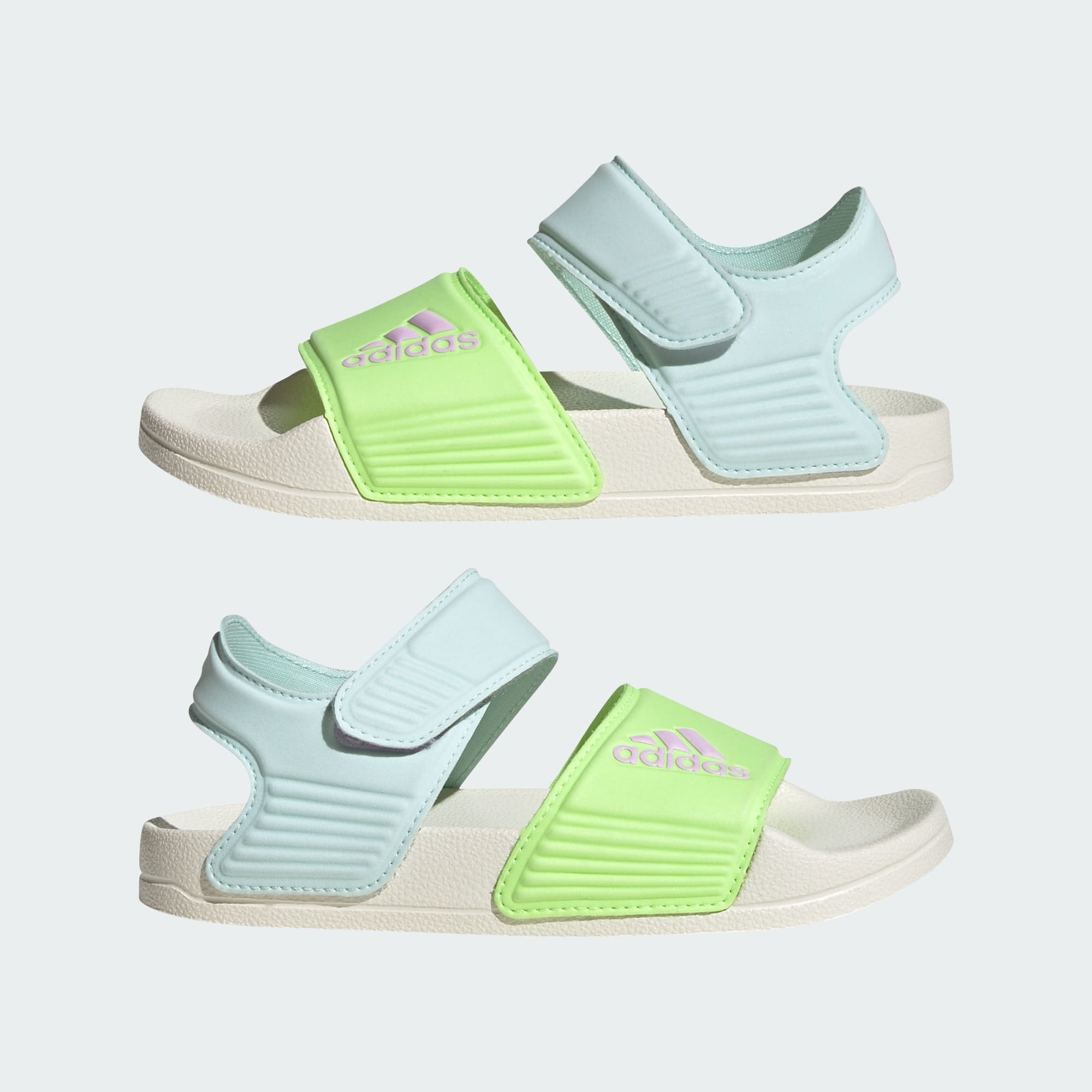Inspired by classic Adilette slides, these kids' adidas sandals are perfect for sunny days of play in and out of the water. A hook-and-loop strap creates an easy on and off. The quick-drying upper lets them play in comfort until they're back on dry land.
