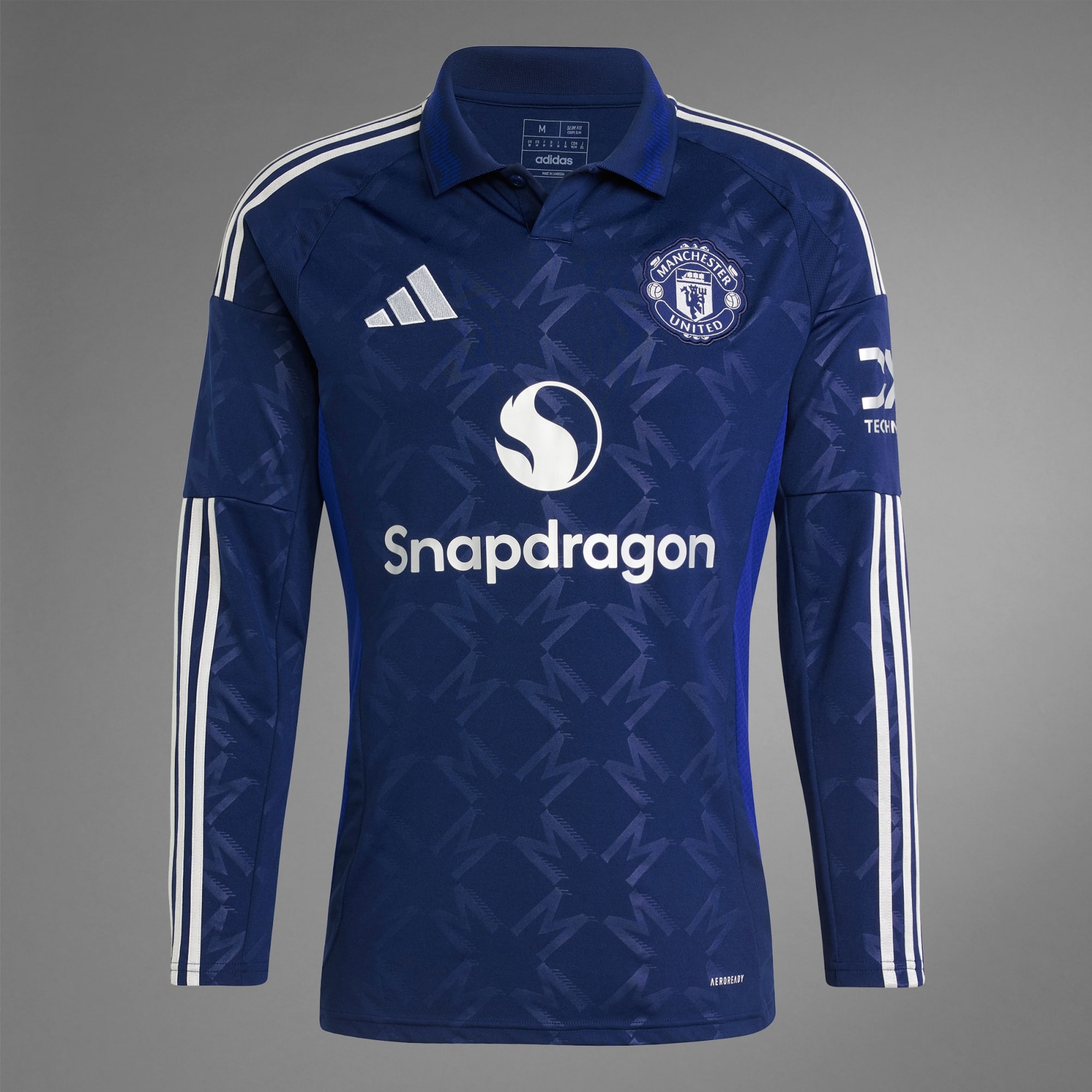 With a bold design that nods to football culture, this adidas Manchester United jersey looks equally at home on and off the pitch. Silver details pop against an indigo base that also includes a subtle, repeating "M" monogram. The light blue graphic on that stylish polo collar pays tribute to the river on which Old Trafford sits. Moisture-managing AEROREADY and long sleeves keep fans comfortable on away days.This product is made with 100% recycled materials. By reusing materials that have already been created, we help to reduce waste and our reliance on finite resources and reduce the footprint of the products we make.