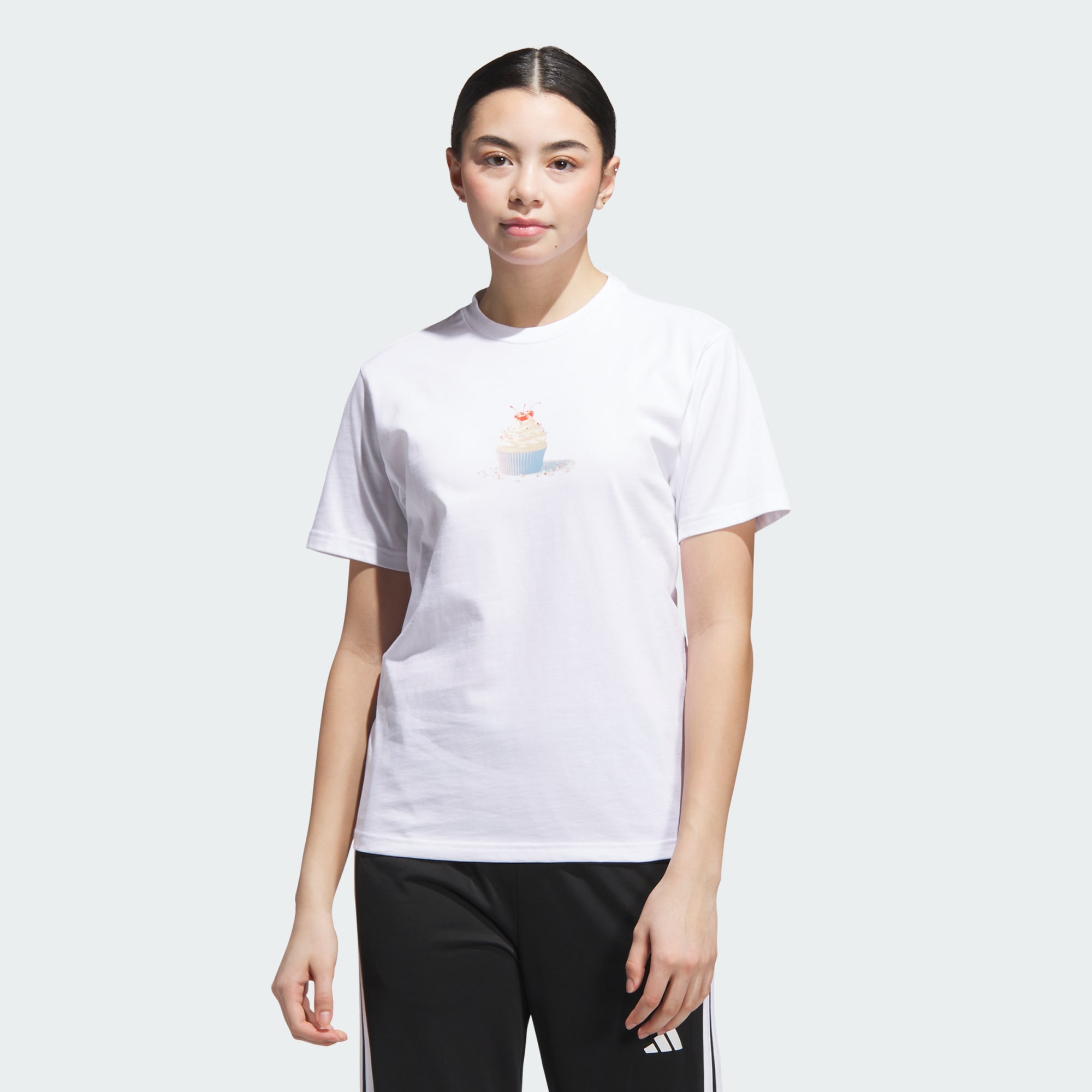 Celebrate life's sweet moments in this adidas tee with a playful cupcake graphic. All about feeling good, it's made in soft, slightly-stretchy cotton. With denim and trainers or joggers and slides, the classic style makes a great match.