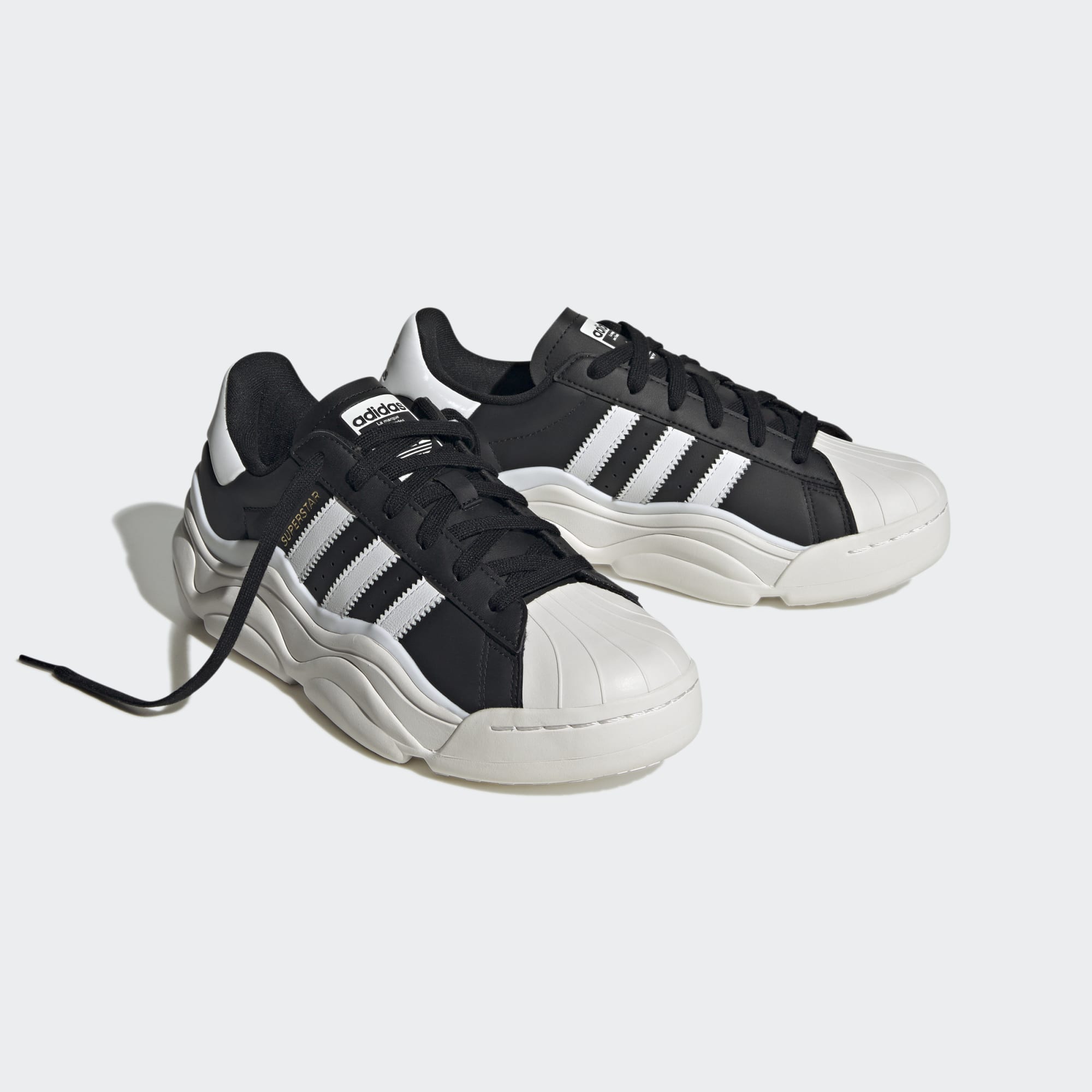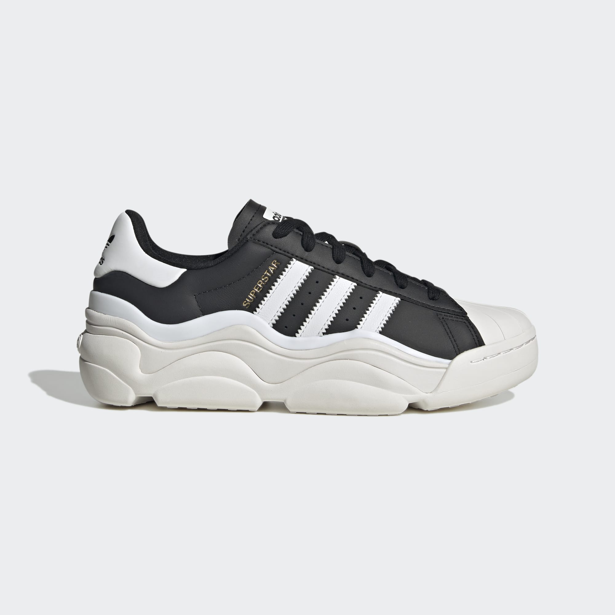 From '70s hardwood classic to everyday footwear staple, the adidas Superstar trainer is a boundary-breaking icon. This version of the shoes dials it up a notch with statement-making proportions emphasised through the interplay of the upper and midsole. The sleek leather upper is taken over by a thick, fluid midsole with double-layered foxing tape for a futuristic feel. A memory foam sockliner lets you stride in comfort and confidence.