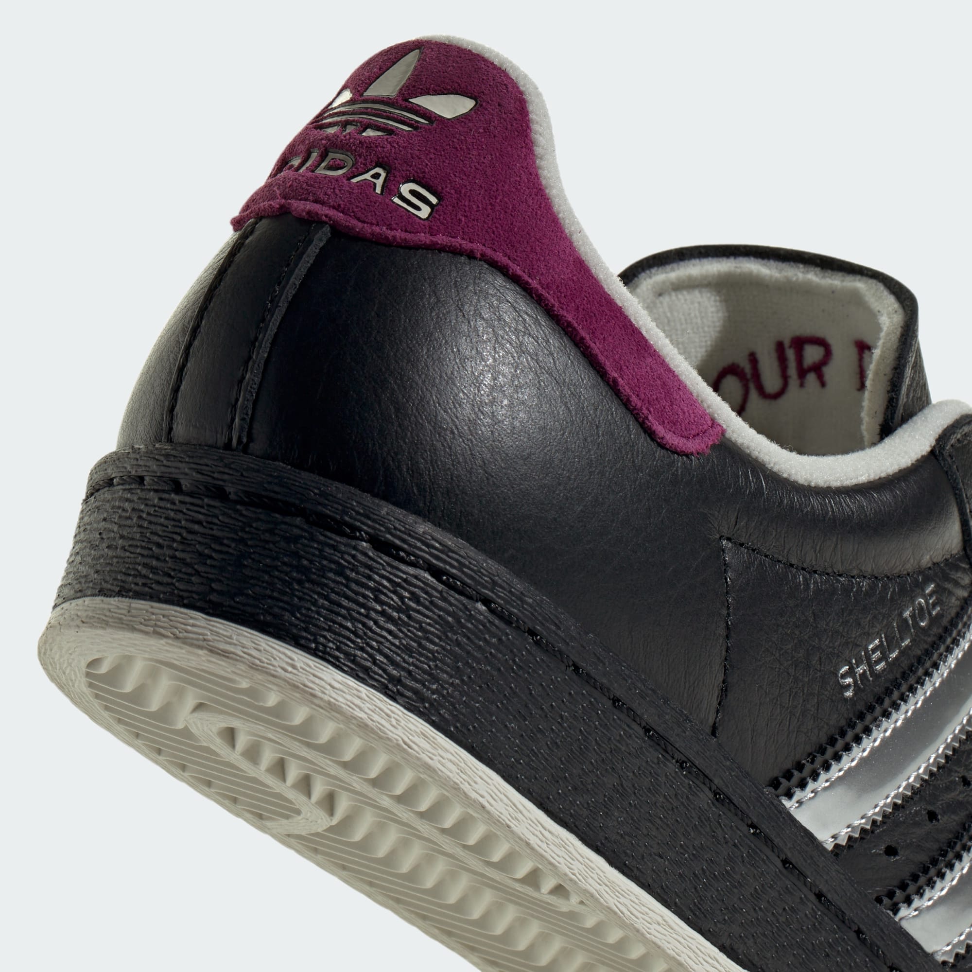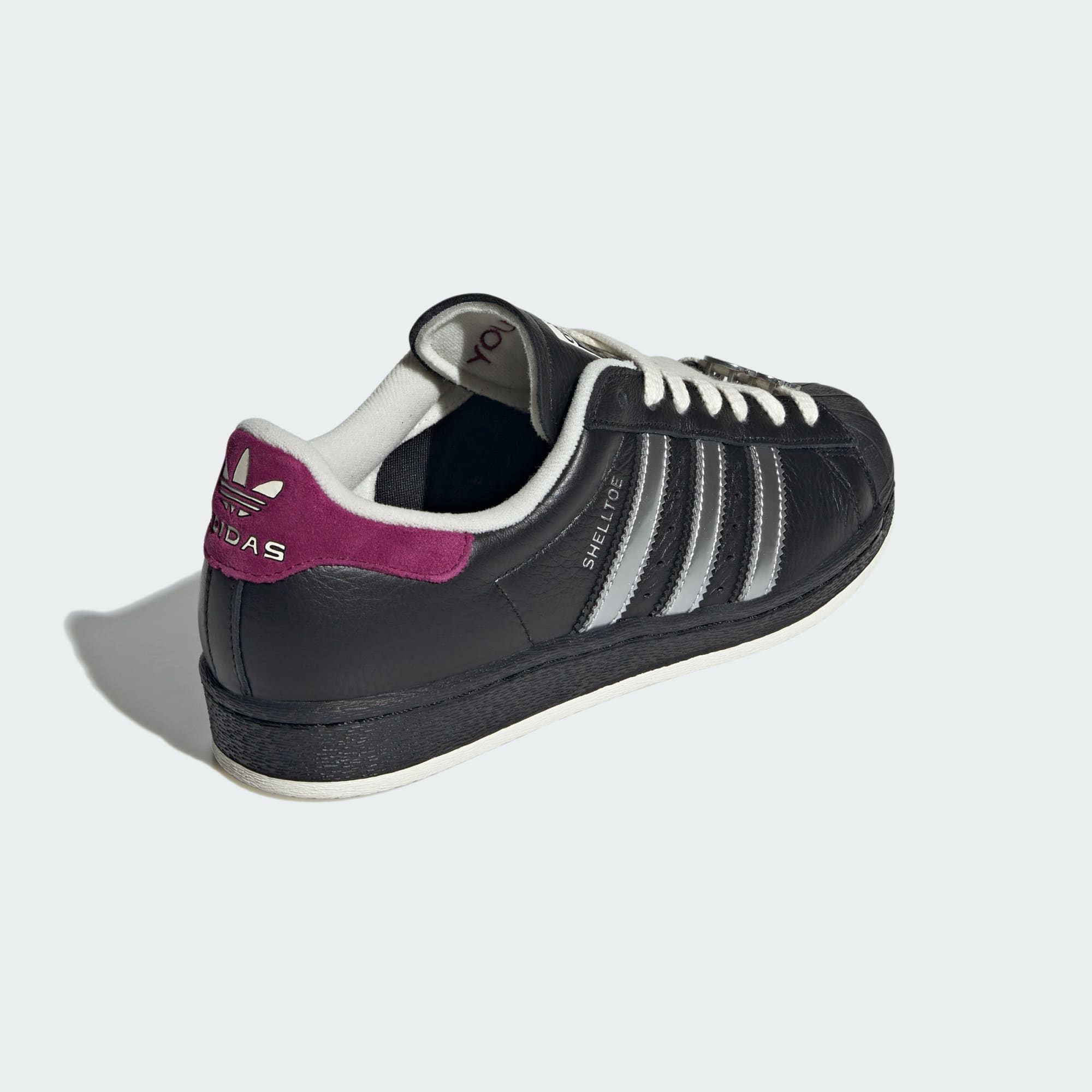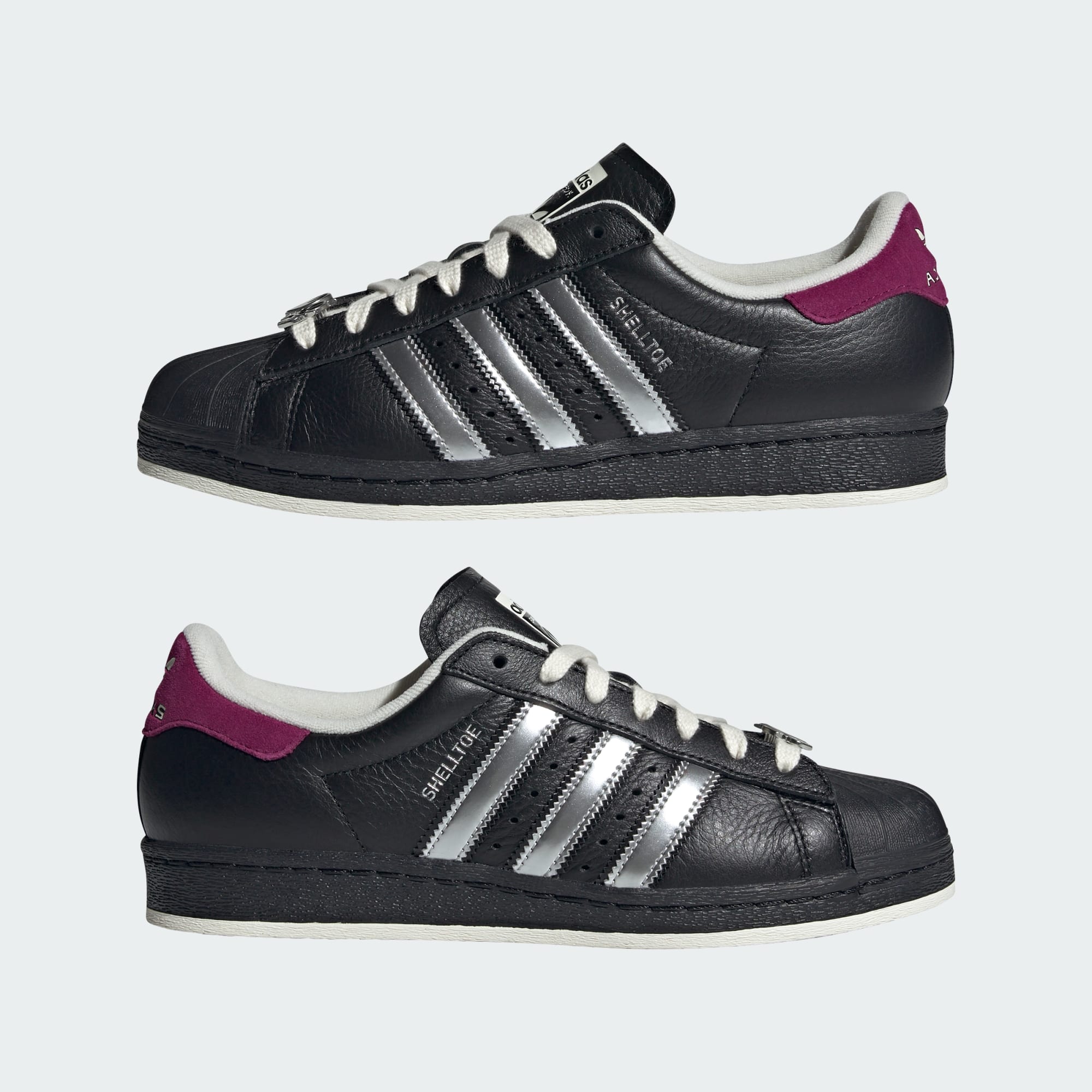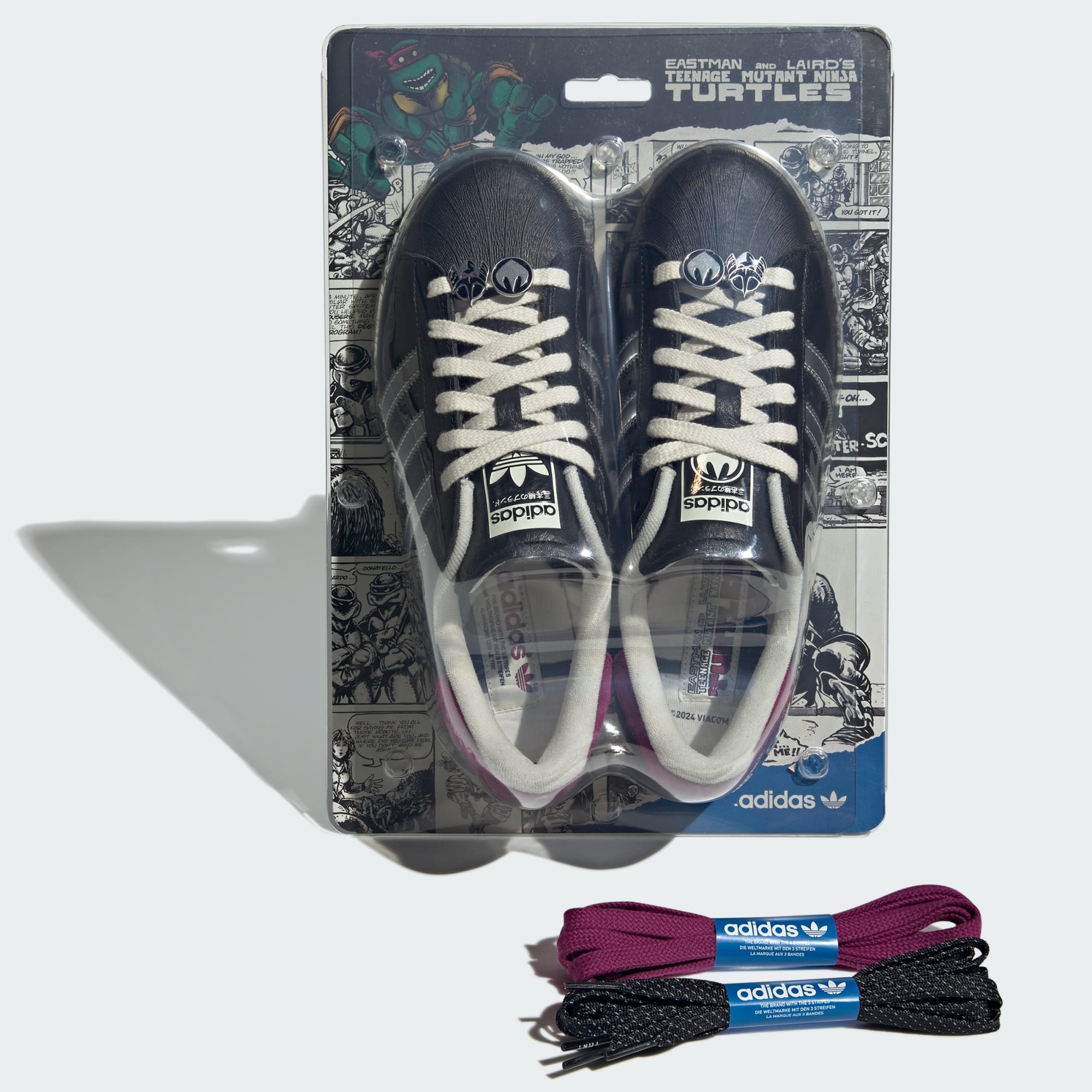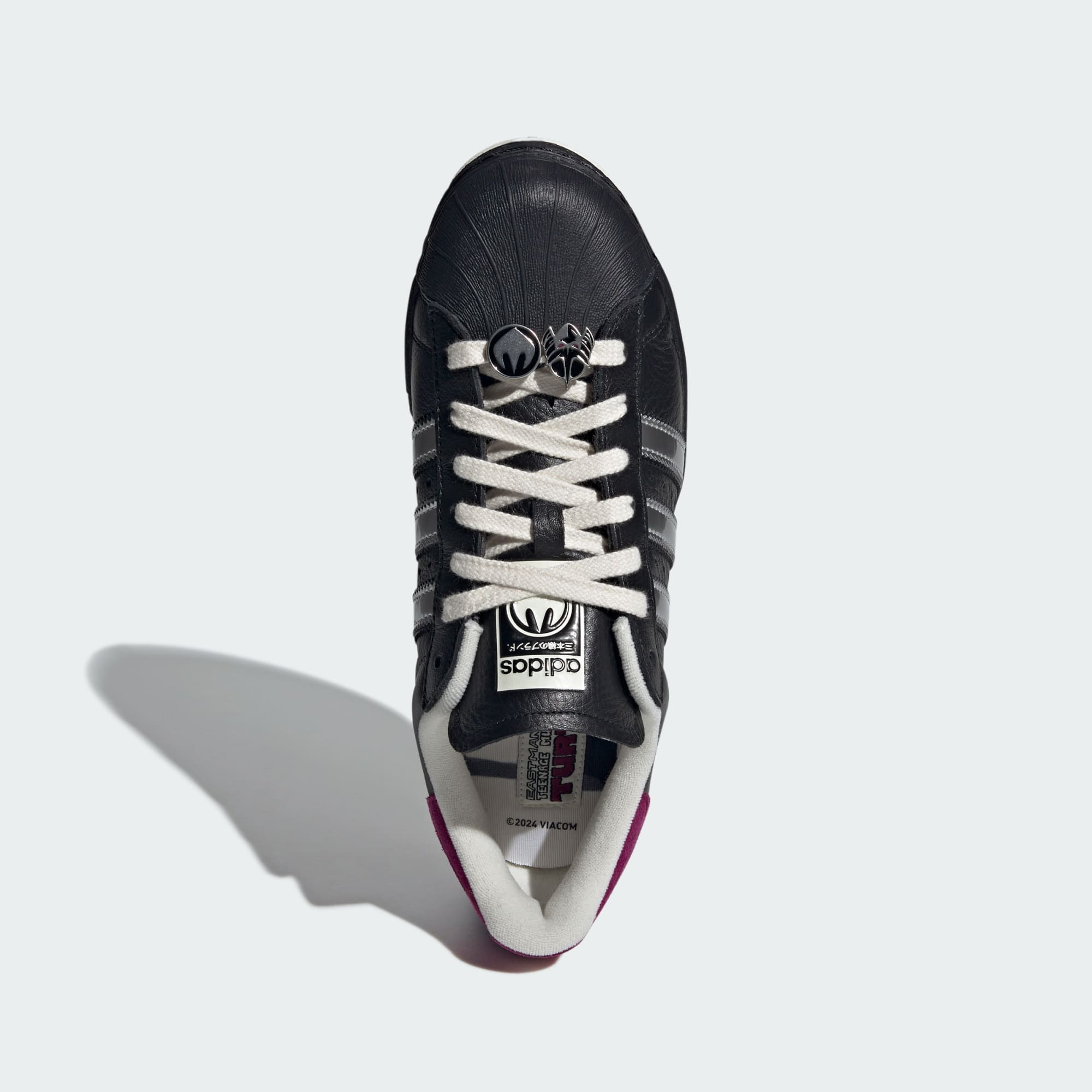The adidas Superstar shoes have never been more ready to take on the world. This pair pays homage to the world of the Teenage Mutant Ninja Turtles, with a special eye on the most ruthless and fan-favorite foe, Shredder. With a smooth leather upper and rubber outsole, metallic silver stripes and sleek black build that goes with anything — we evoke the look of one of the greatest comic book villains of all time. Traditionally written in French, the brand's iconic slogan is written in Japanese, a nod to Shredder's roots, and above the three stripes, "Superstar" is replaced with "Shredder," and "COME FACE YOUR DOOM" is written on the tongue. Special lace jewels commemorate the iconic antagonist, and three sets of laces let you change out your look. Inside each toy inspired box is its very own re-print of the second-ever issue of the Teenage Mutant Ninja Turtles comic by Kevin Eastman and Peter Laird that inspired the drop. Tap into '90s nostalgia with the legacy of the TMNT.