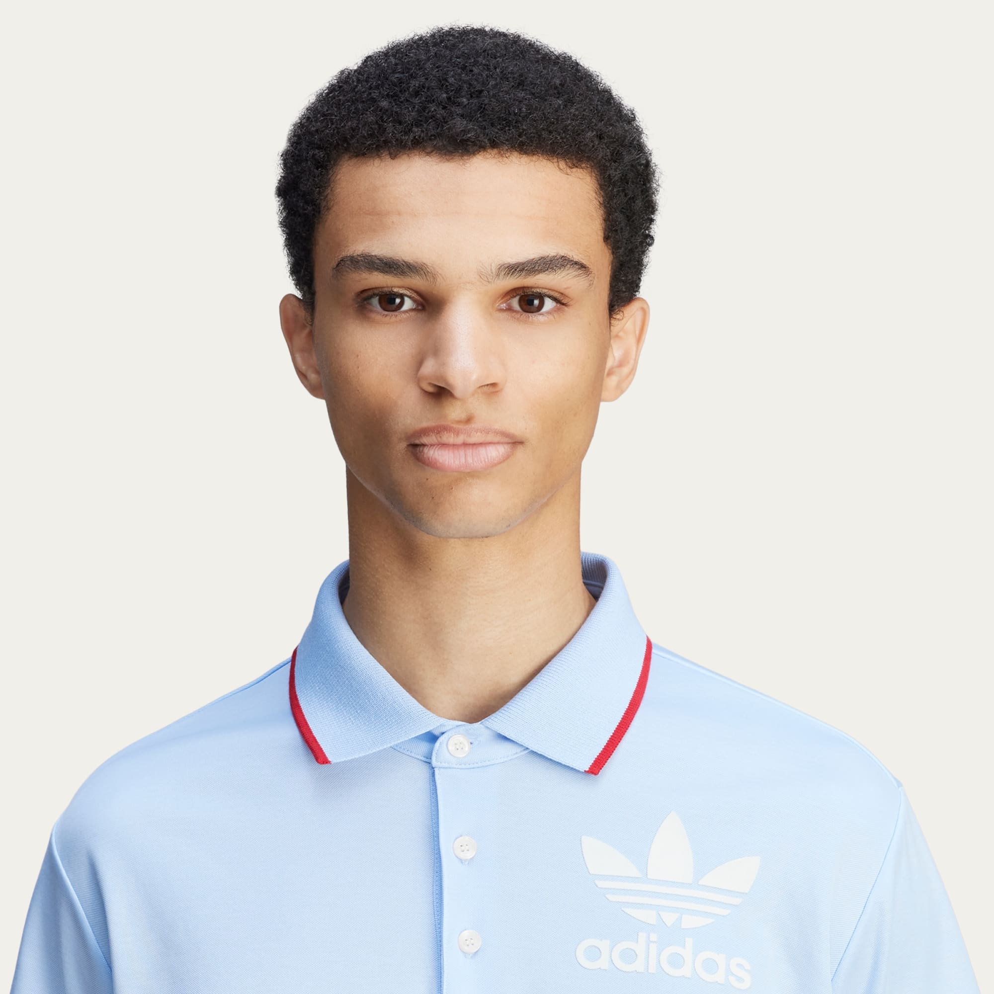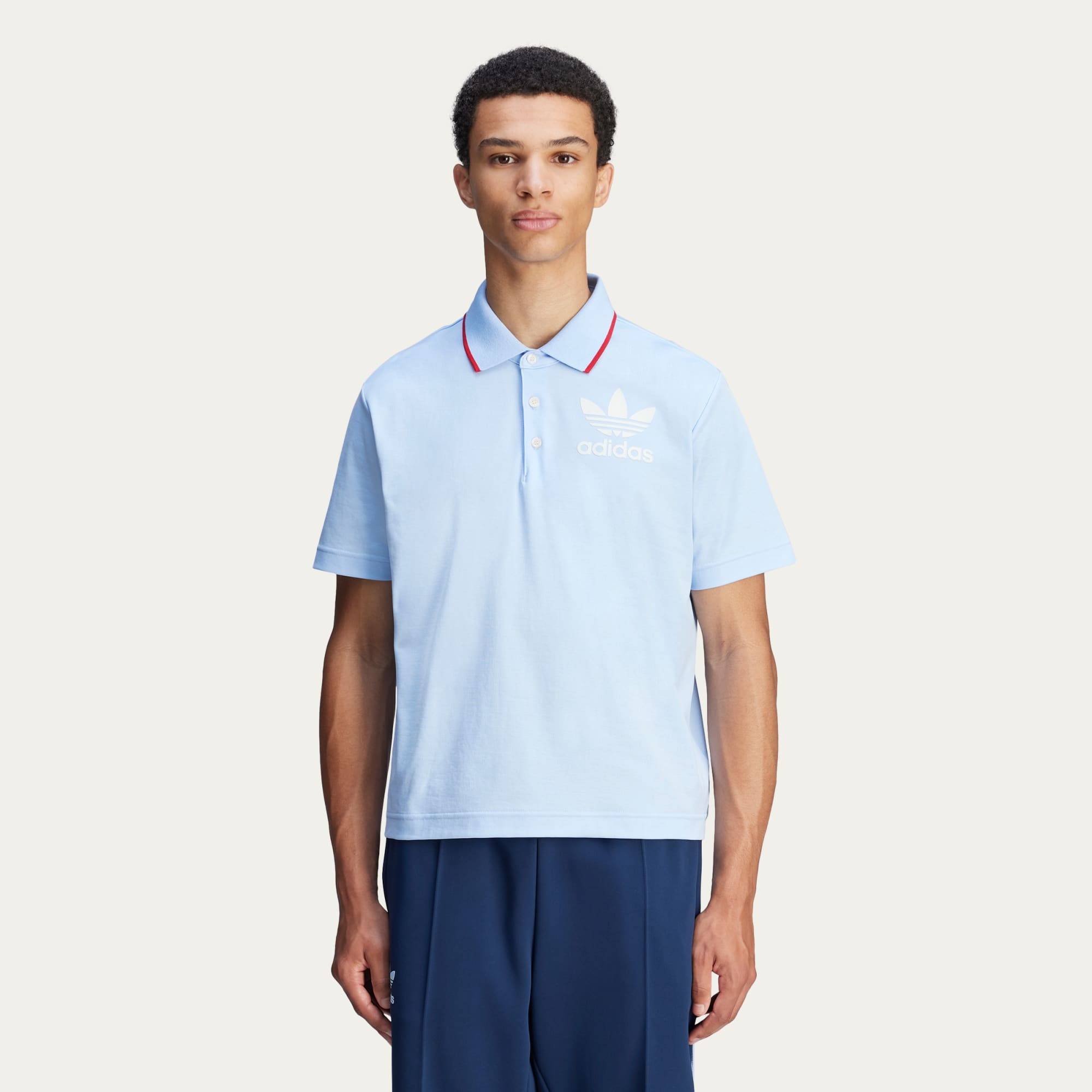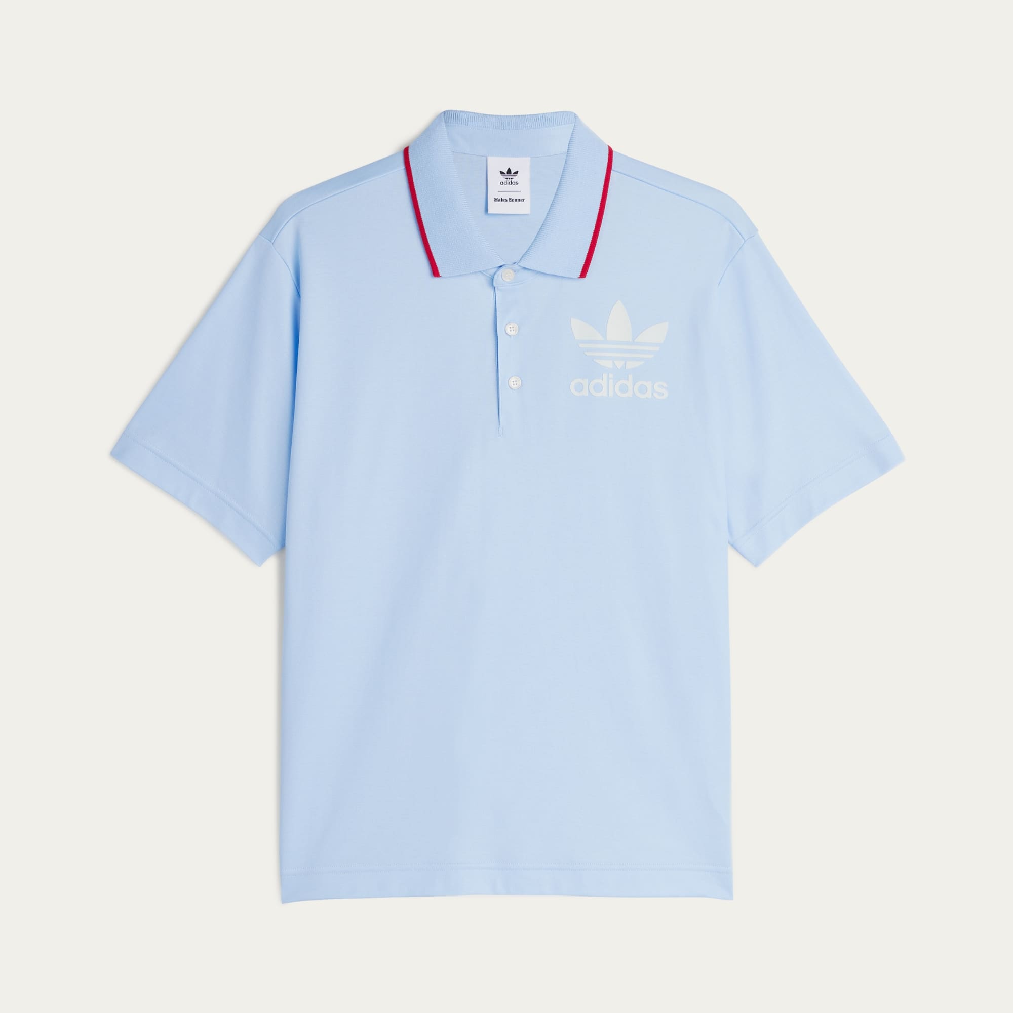 The Fall/Winter 2024 collection from adidas and Wales Bonner merges tradition with modernity in a celebration of hip hop movement and romanticism. Music and creative vibrancy are threaded into the collection through the textures, shapes and colours across the pieces. The Wales Bonner Short Sleeve Polo Shirt is done in a soft, pale blue. It's crafted from a premium cotton and recycled polyester blend, and is accented with two contrast details — the red on the collar which complements the Wales Bonner logo on the back, and the white adidas Trefoil logo.